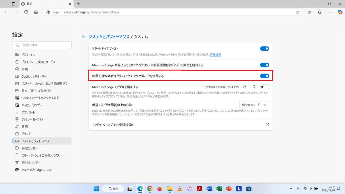 「ハードウェアアクセラレーション」を無効化することで、解消することがあります。